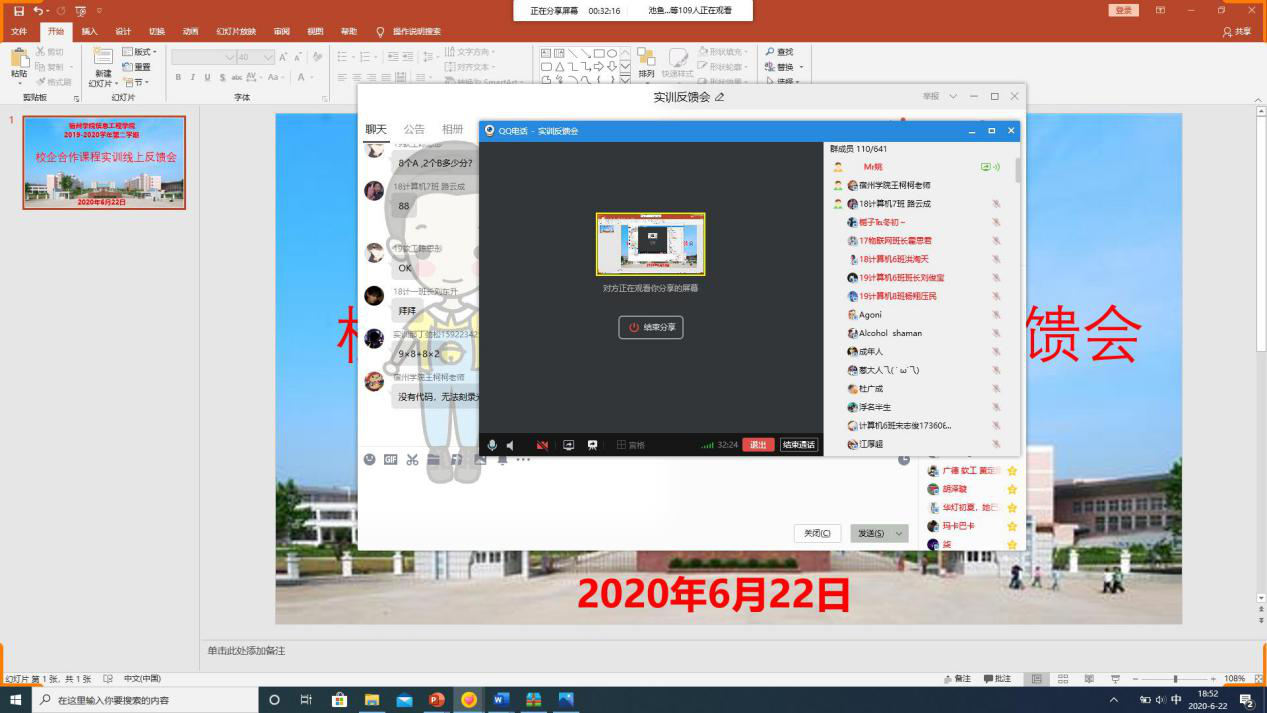 2020年6月22日星期一下午六点,实验实训助理总队王柯柯老师和助理总队负责人姚海洋同学组织2019级、2018级、2017级全体同学开展校企合作课程实训线上反馈会。收取学生对于本次实训的意见反馈,并再次指导本次线上实训材料的收集和校对方法。