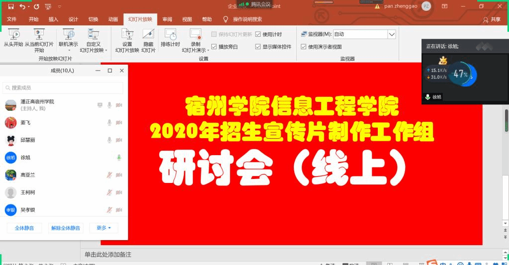 2020年7月25日20:30,为了做好2020年信息工程学院的招生宣传工作,在宋启祥院长和路红梅书记的指导下,信息工程学院召开2020年招生宣传片制作工作线上会议。实习实训中心主任潘正高、党务秘书张万礼、教学科研秘书徐旭、办公室主任刘皖苏、各专业教研室主任崔琳、姜飞、谈成访、邱慧丽、周玮、高亚兰及相关教师参加会议,会议由副院长吴孝银主持。