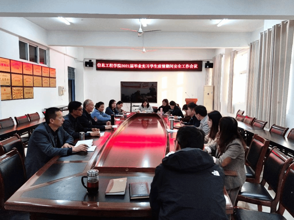 根据学校最新的疫情防控工作要求,为了进一步加强毕业实习学生的安全管理工作,2020年11月11日下午16:00,信息工程学院在工B315会议室召开2021届毕业实习疫情期间学生安全工作会议。信息工程学院党总支副书记吴翠华、副院长吴孝银、科级干部、各专业教研室主任、各专业带头人以及2021届辅导员参加了会议。会议由信息工程学院院长宋启祥主持。