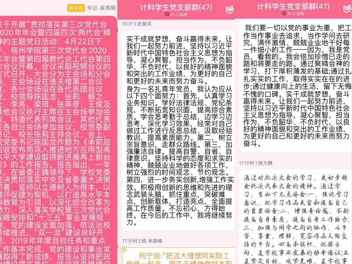 4月22日下午,宿州学院第三次党代会2020年年会暨第四届教代会工代会第四次会议开幕。并于4月23日下午圆满完成各项议程,胜利闭幕。4月27日,计科学生党支部利用线上qq群开展学习“宿州学院第三次党代会2020年年会暨四届四次‘两代会’精神”主题党日活动。活动由吴雨桐书记主持,全体支部党员参加。