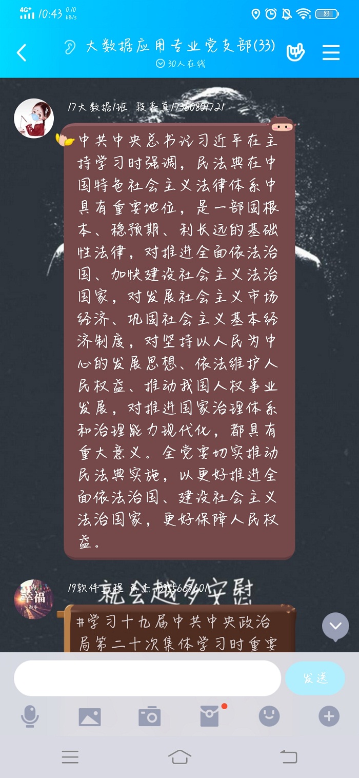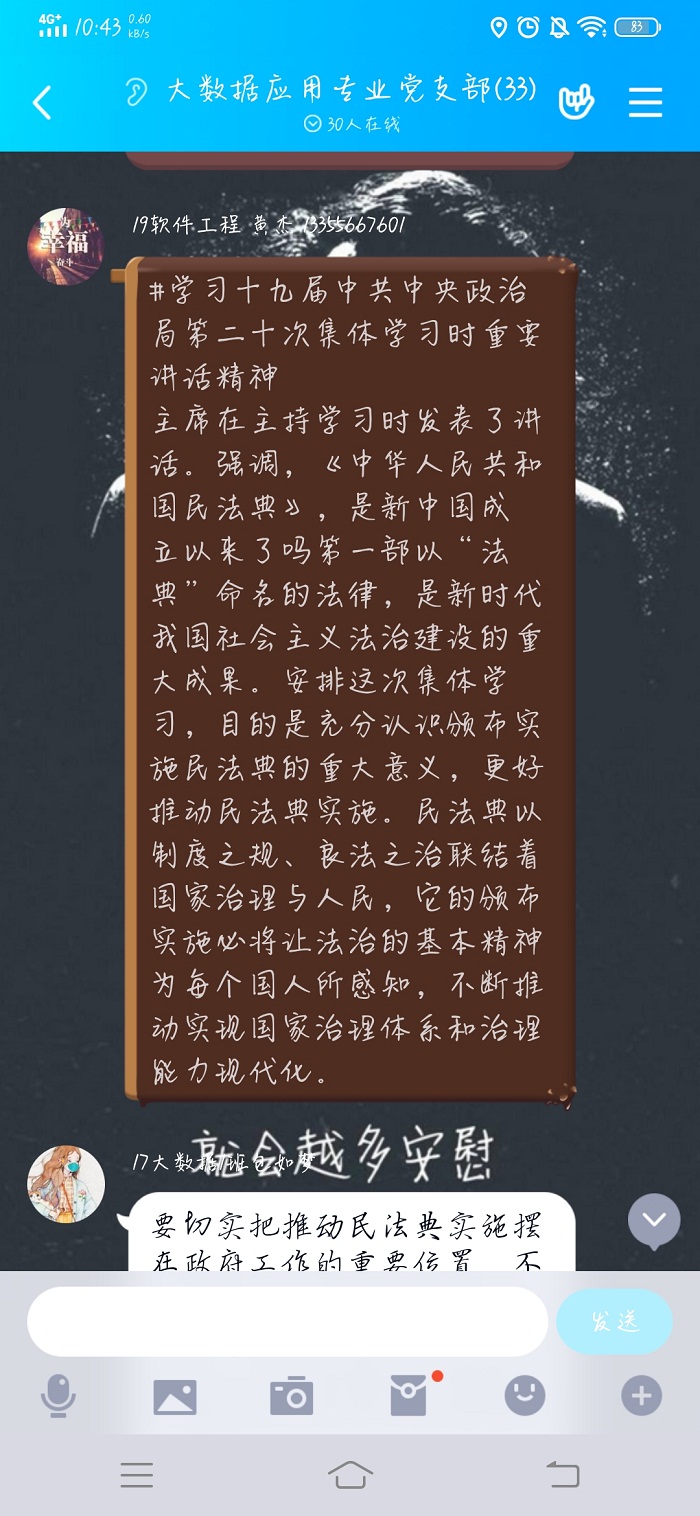 为加强理论学习,信息工程学院大数据应用学生党支部开展线上学习习近平总书记在主持中央政治局第二十次集体学习时的重要讲话精神和《中华人民共和国民法典》交流学习活动。宿州学院大数据应用学生党支部全体党员参与了本次活动。
