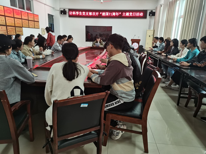 为了庆祝“新中国成立71周年”,增强党员的爱国热情,2020年10月13日中午,计算机科学与技术专业学生党支部在工B315开展“建国71周年”诗歌朗诵主题党日活动,活动由党支部书记吴雨桐主持,全体支部党员参与。