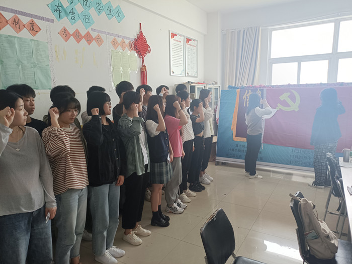 会上,发展对象汇报了对党的认识、入党动机、本人履历、家庭和主要社会关系等情况,并向党组织说明了有关问题;入党介绍人介绍了各发展对象的有关情况,并对其能否入党表明了意见;大会对发展对象能否入党进行了充分讨论,采取无记名投票的方式进行表决,同意接收楚尚云、宋峻宇、夏晶晶、徐康伟、杨淼等9名同学为中共预备党员。在全部预备党员接收之后,在场的所有人员面向党旗庄严宣誓。