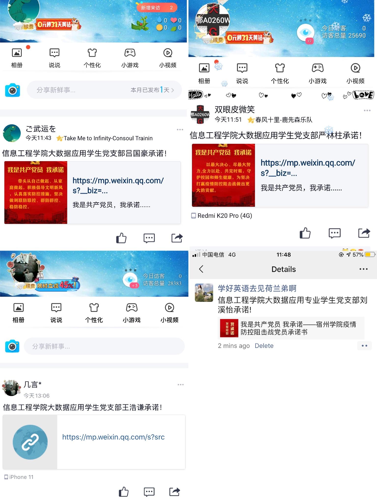 首先,大数据应用专业学生党支部书记李小燕在群中发布学习文件《安徽党委的一封信》、“防控新型冠状病毒感染肺炎温馨提示”和《致全体同学的一封信》,希望各位认真加强理论学习,进一步提高政治站位,把思想和行动统一到习近平总书记关于疫情防控工作重要指示精神上来,以实际行动为党旗增辉添彩。其次,全体成员在视频会议中展开“面对此次疫情,党员该如何做”的话题进行热烈讨论:段秀真认为,疫情之下,不做捣乱者,疫情之下无小事,不说做贡献,首先不做捣乱者才是最主要的,众志成城,才能渡过难关;张雪琦认为,疫情之下,我们不仅仅要做好自己,也要向那些我们看不见的人学习,不仅学习他们无私奉献的精神,更要学习他们疫情之下每一个红亮亮的爱国心;裴明虎认为,在灾难面前,作为共产党员,不需要的物资,不要跟风抢,不真实的信息,不要无脑传,不必要的见面,不要出门见等等。最后,全体成员承诺,通过微信、QQ转发宿州学院党员承诺书,以表决心。