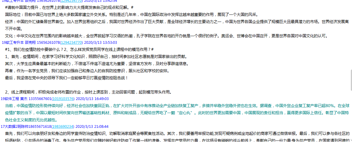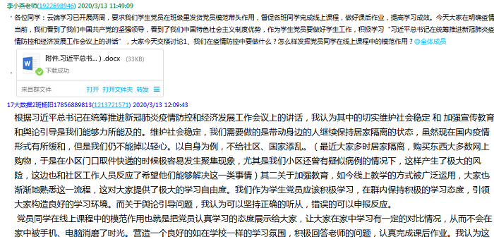 随后,群内党员同学发表积极讨论:17大数据2班杨阳:根据习近平总书记在统筹推进新冠肺炎疫情防控和经济发展工作会议上的讲话,我认为其中的切实维护社会稳定和加强宣传教育和舆论引导是我们能够力所能及的。维护社会稳定我们需要做的是带动身边的人继续保持居家隔离的状态,虽然现在国内疫情形式有所缓和,但是我们仍不能掉以轻心,不给社区、国家添乱。党员同学在线上课程中的模范作用就是把党员认真学习的态度展示给大家,让大家在家中学习有一定的对比情况,从而不会在家中被手机、电脑消磨了时光。营造一个良好的如在学校一样的学习氛围,积极回答老师的问题,认真完成课后作业。我认为这就是我们应该做的事情。17大数据1班程森: 习近平总书记铿锵有力的话语,“生命重于泰山。疫情就是命令,防控就是责任。”“让党旗在防控疫情斗争第一线高高飘扬。”传递着党和政府抗击疫情的坚定决心,彰显着人民利益高于一切的永恒主题。作为共产党员,我们一定要充分发挥先锋模范作用,不忘初心、牢记使命,挺身而出、英勇奋斗,坚决贯彻坚定信心、同舟共济、科学防治、精准施策的总要求,做到疫情在哪里,共产党员的身影就出现在哪里,鲜红的党旗就高高飘扬在哪里,为坚决打赢疫情防控的人民战争、总体战、阻击战作出重要贡献。作为学生党员,我们要身体力行、模范践行疫情防控要求,注重养成良好的个人生活习惯和公共卫生习惯,积极做好安全防护措施,外出一律戴口罩,勤洗手、勤消毒、勤通风,及时向单位和组织报告个人及家人身体状况,自觉配合做好疫情筛查检测。带头并带动亲属减少外出,做到不串门、不聚会、不聚餐,不到人员密集的场所,有效切断病毒传播途径。此次讨论共有31名党员参与。