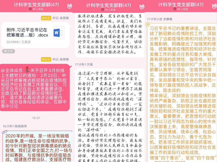 为深入学习习近平总书记在统筹推进新冠肺炎疫情防控和经济社会发展工作部署会议上重要讲话,贯彻落实习近平总书记重要讲话精神,带领学生党员坚定自觉向党中央和习近平总书记看齐,计科学生党支部于3月16日利用学习强国APP、QQ群等平台开展网上主题党日活动。