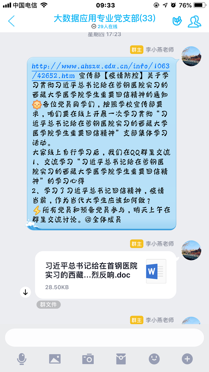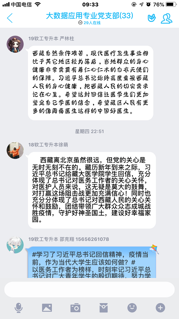 为认真学习领会习近平总书记的回信精神,2020年3月20日上午,大数据应用专业党支部李小燕老师带领支部全体党员,依托QQ平台开展了线上交流学习“习近平总书记给在首钢医院实习的西藏大学医学院学生重要回信精神”活动。