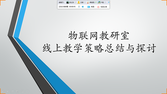 会上,高亚兰老师表示物联网教研室为了能更好地实施线上教学,提高线上教学的质量安排了本次研讨会。物联网教研室教师们首先分别从自身的线上教学情况,例如线上师生互动形式、作业批改等方面重点进行了分析讨论。之后大家分别从自己使用的线上教学工具如超星学习通、腾讯课堂、QQ分享屏幕等各种线上教学工具的优势与不足进行了总结与探讨。最后各位老师根据近期的线上教学情况总结了很多有效的教学方法,例如在课堂教学过程中加强学生的提问环节,加强学生的监督管理,杜绝学生刷视频的行为等。