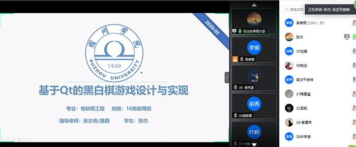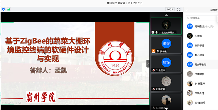 2020年5月16日,信息工程学院开展了毕业设计答辩工作。考虑到处于疫情防控的特殊时期,为了确保师生的健康安全,物联网工程专业针对2020届毕业生组织开展了毕业设计线上答辩活动,本专业56名毕业生全部参与此次答辩,答辩共分成2组,各组主要通过腾讯会议、QQ分享屏幕等方式进行线上答辩。