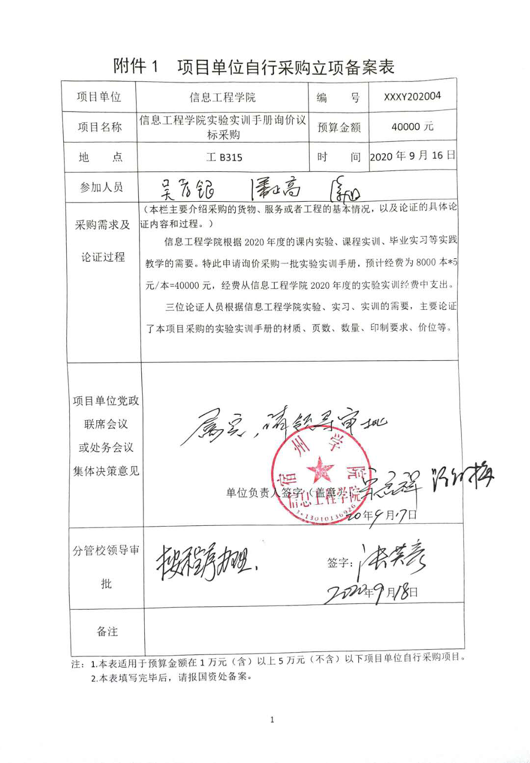 信息工程学院根据2020年度的课内实验、课程实训、毕业实习等实践教学的需要。特此申请询价采购一批实验实训手册,预计经费为8000本*5元/本=40000元,经费从信息工程学院2020年度的实验实训经费中支出。