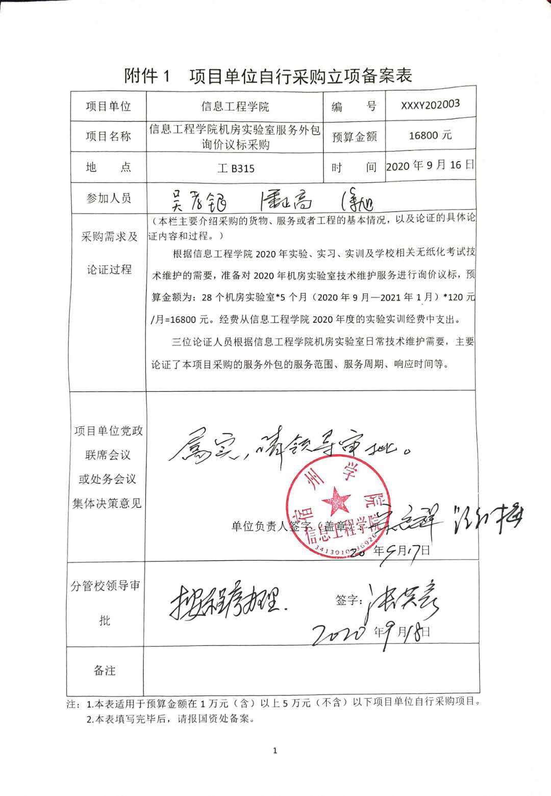 根据信息工程学院2020年实验、实习、实训及学校相关无纸化考试技术维护的需要,准备对2020年机房实验室技术维护服务进行询价议标,预算金额为:28个机房实验室*5个月(2020年9月—2021年1月)*120元/月=16800元。经费从信息工程学院2020年度的实验实训经费中支出。