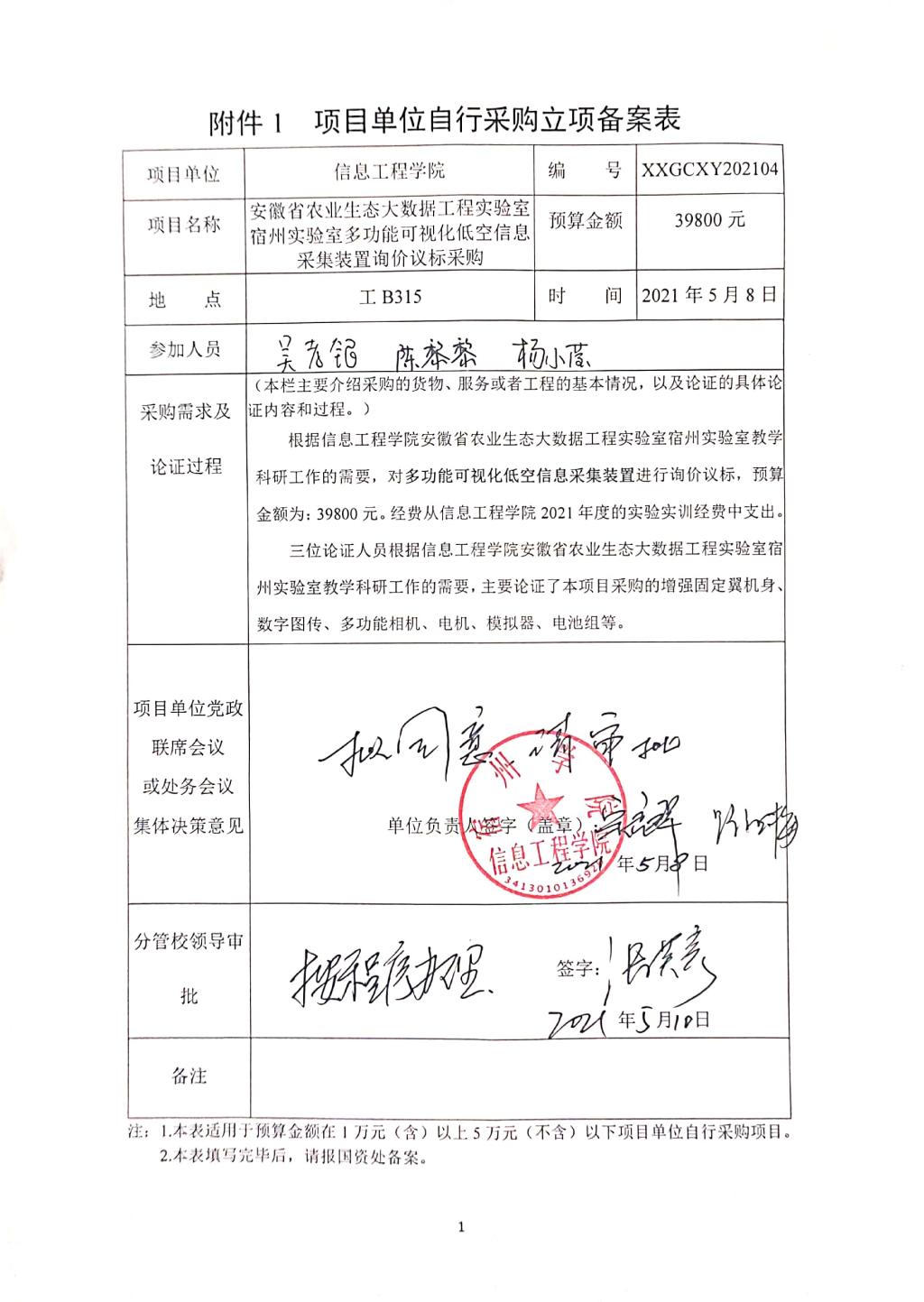 根据信息工程学院安徽省农业生态大数据工程实验室宿州实验室教学科研工作的需要,对多功能可视化低空信息采集装置进行询价议标,预算金额为:39800元。经费从信息工程学院2021年度的实验实训经费中支出。