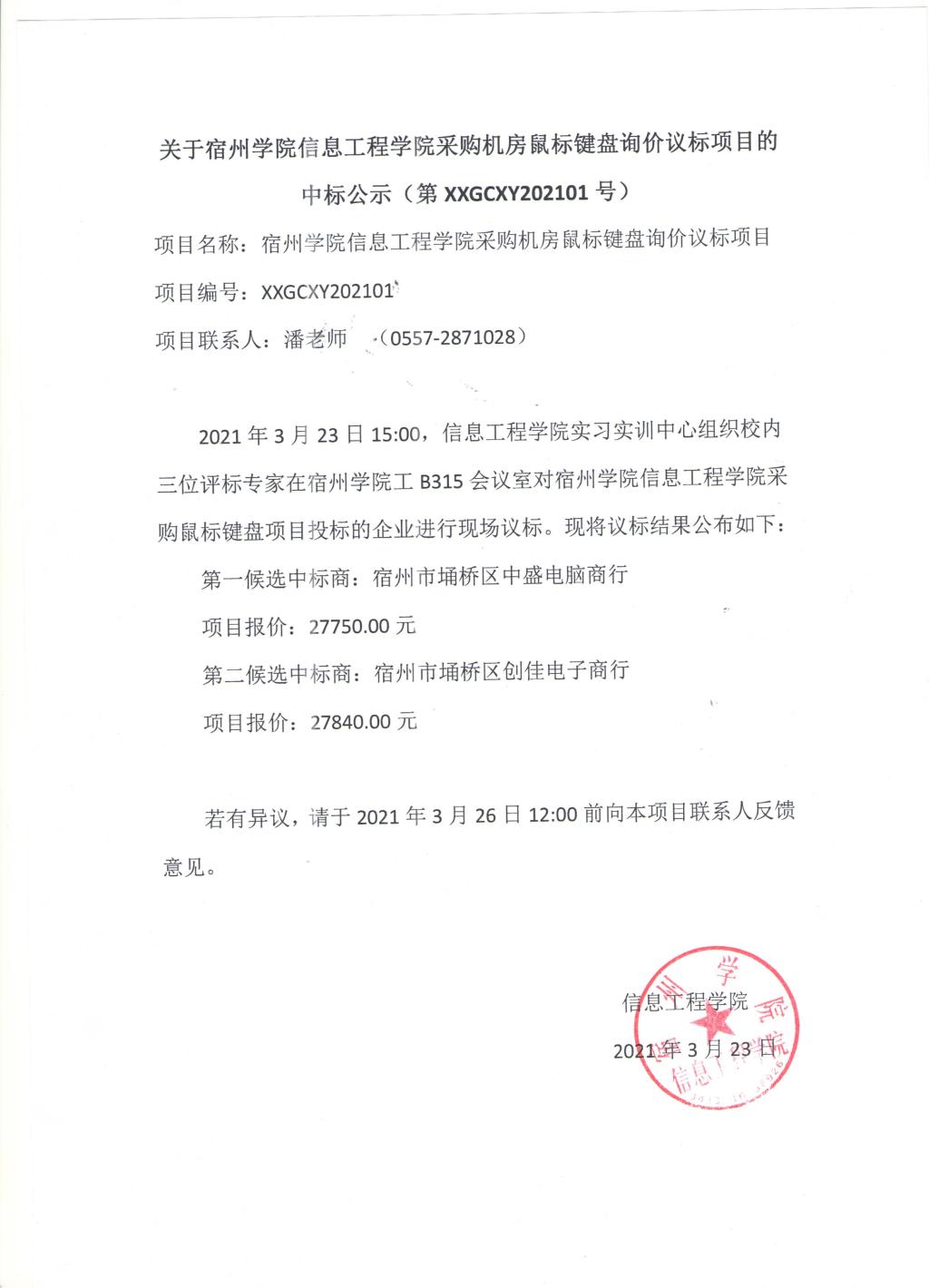 2021年3月23日15:00,信息工程学院实习实训中心组织校内三位评标专家在宿州学院工B315会议室对宿州学院信息工程学院采购鼠标键盘项目投标的企业进行现场议标。现将议标结果公布如下: