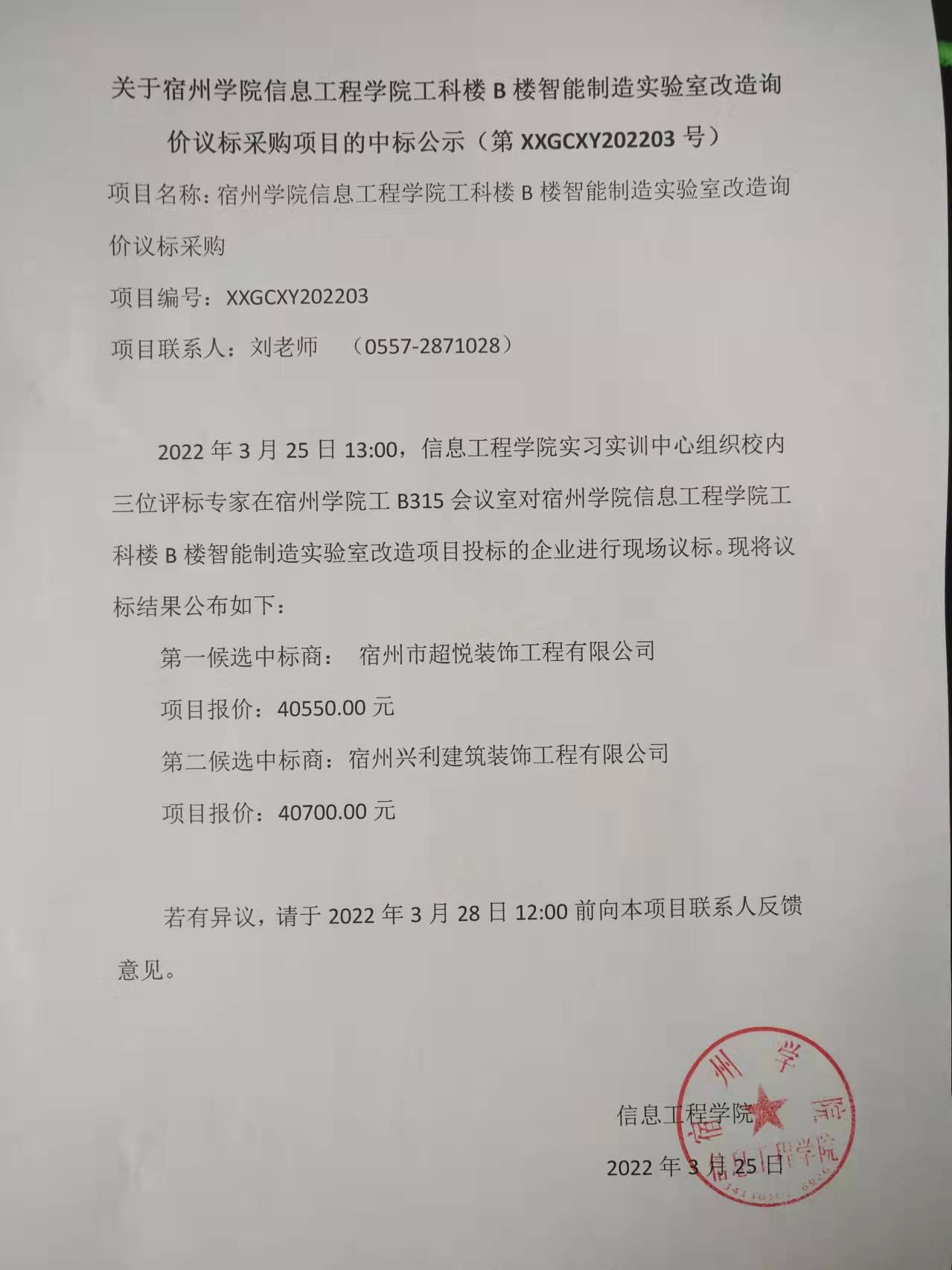2022年3月25日13:00,信息工程学院实习实训中心组织校内三位评标专家在宿州学院工B315会议室对宿州学院信息工程学院工科楼B楼智能制造实验室改造项目投标的企业进行现场议标。现将议标结果公布如下:
