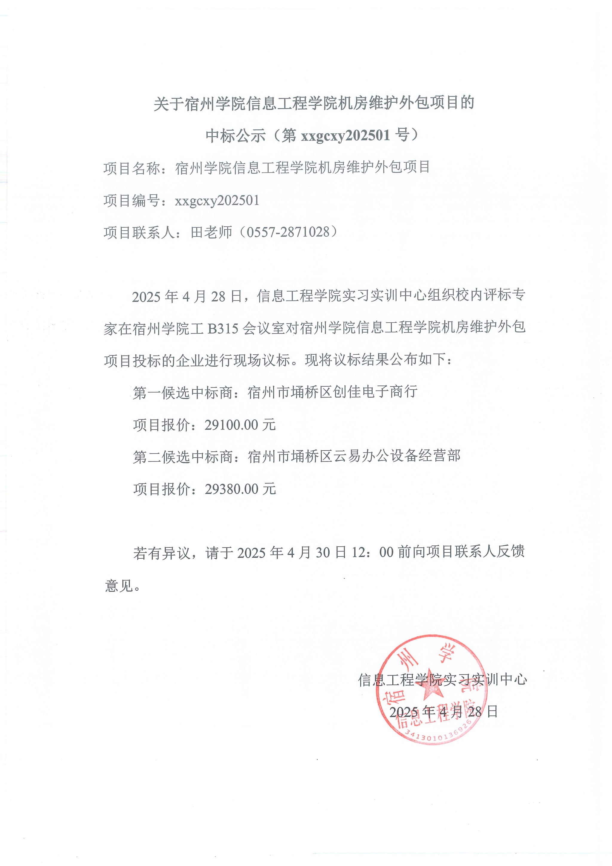 2025年4月28日,信息工程学院实习实训中心组织校内评标专家在宿州学院工B315会议室对宿州学院信息工程学院采购机房维护外包项目投标的企业进行现场议标。现将议标结果公布如下: