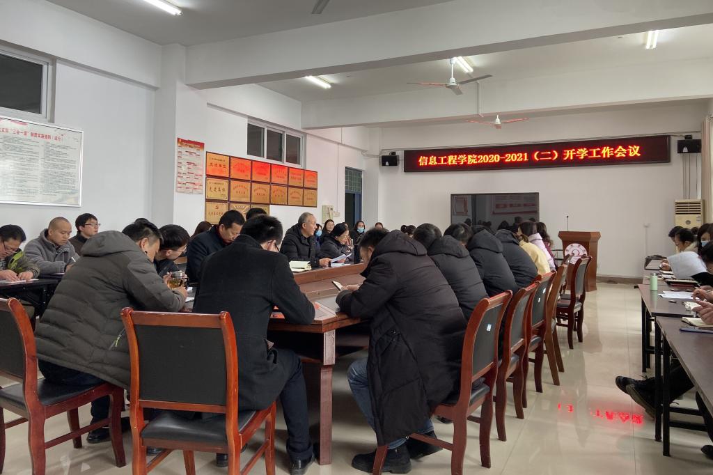 会上,宋院长首先对信息工程学院2020-2021学年第二学期工作重点进行安排:首先针对科研奖励给大家打了一剂强心针,强调每位老师都要时刻关注科技处网站最新动态,积极申报2021年的各类教科研项目,及早做好申报、验收、结项等准备工作。其次,强调要高度重视学期初的教学巡视工作,各位任课老师要对教学材料以及教学内容进行梳理准备,教学科研秘书与实验室主任要分别为课堂教学做好课表安排、机房实验环境等相关准备,务必保证课堂教学工作的顺利进行。再次,强调各科室要围绕省级专业综合评估工作开展各项准备工作。之后吴院长对上学期期末教学检查详细内容以及本学期的具体工作进行了介绍:首先,上学期期末进行的期末教学检查,信息工程学院的试卷材料以及实践教学材料都存在问题,每位教师必须严格按照要求完善相关材料;其次,针对本学期的毕业设计工作进行了相关安排,强调各位老师要严格按照时间节点督促学生完成毕业设计的选题、开题、任务书等工作。最后路书记针对新生开学第一周的上课秩序再次进行了强调部署。