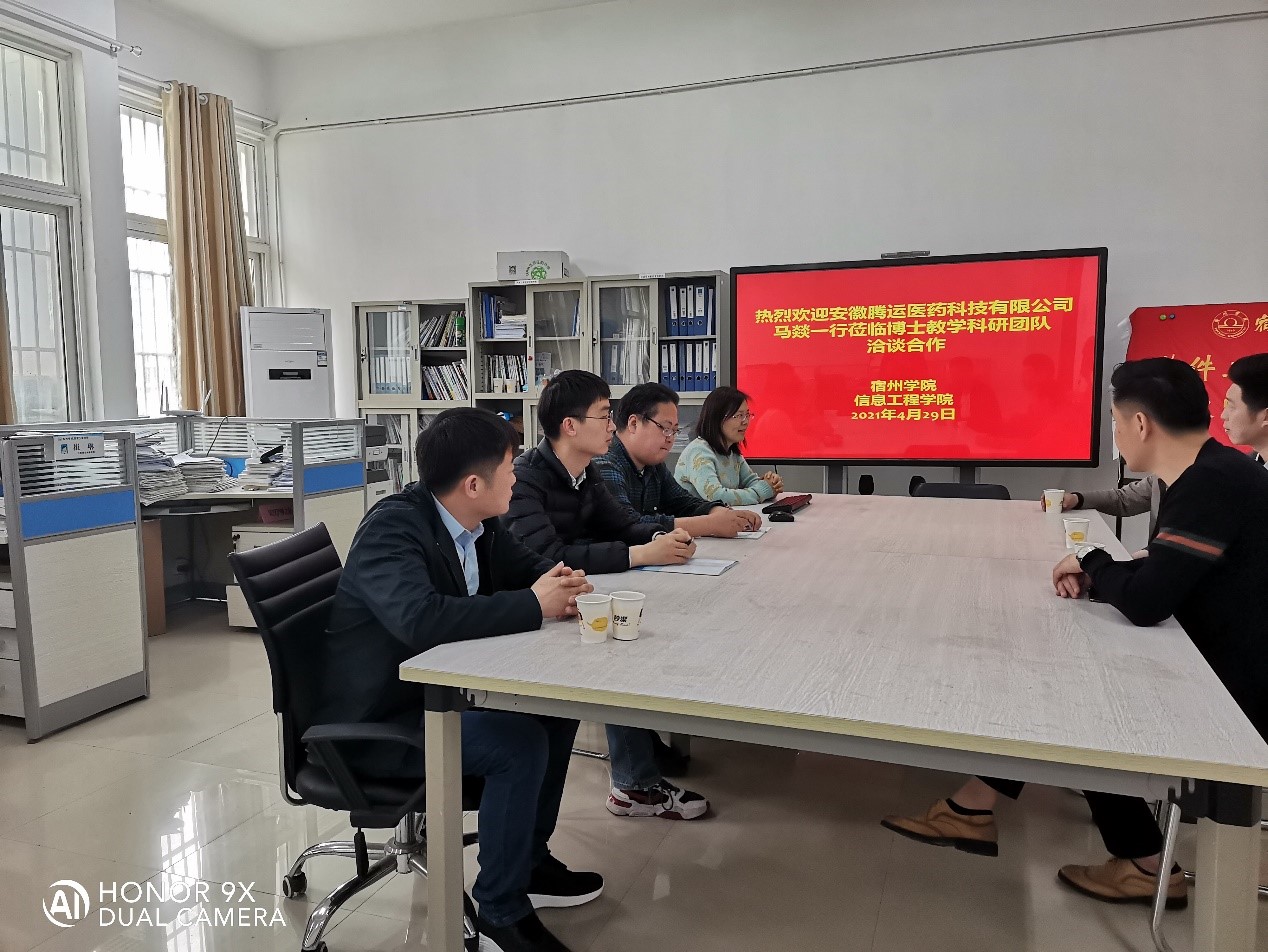 为助力高质量内涵式发展,建设特色鲜明的地方应用型高水平大学,落实服务地方经济社会发展的要求,由信息工程学院崔琳博士联系,2021年4月29日上午,信息工程学院博士教学科研团队与安徽腾运医药科技有限公司于工科楼B308办公室洽谈合作,并就具体的合作事宜进行了座谈。参加此次合作洽谈的有信息工程学院软件工程教研室主任崔琳博士、实习实训中心主任潘正高教授、公共教研室主任姜飞博士、张守震博士以及张志伟博士等。