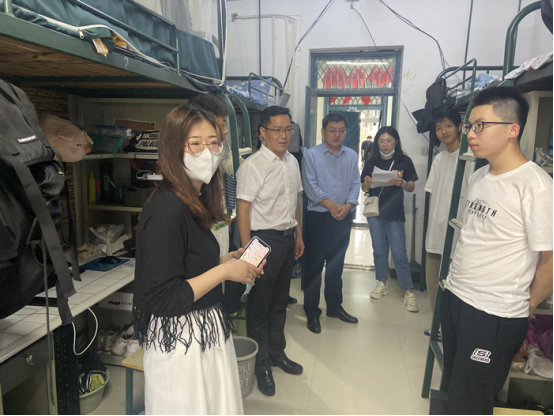 余晓永一行来到学生宿舍,查看了学生宿舍基础设施、环境卫生等情况,并深入寝室与同学们亲切交流。希望同学们做好宿舍内务整理,保证宿舍安全干净整洁,维持良好宿舍环境,提醒大家要提高疫情防护意识,并强调学生安全问题无小事,教导学生要加强寝室安全意识,妥善保管自己的贵重物品。