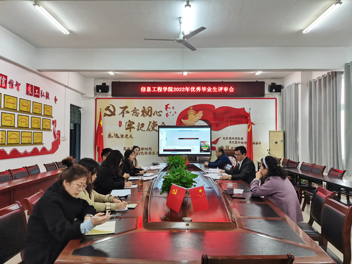 为做好2022年优秀毕业生推荐工作,信息工程学院于2022年3月14日上午召开2022年优秀毕业生评审会,会议由信息工程学院党委副书记(临时负责)余晓永主持,信息工程学院党委副书记吴孝银、组织员(副处级)黄永刚及全体辅导员参加会议。