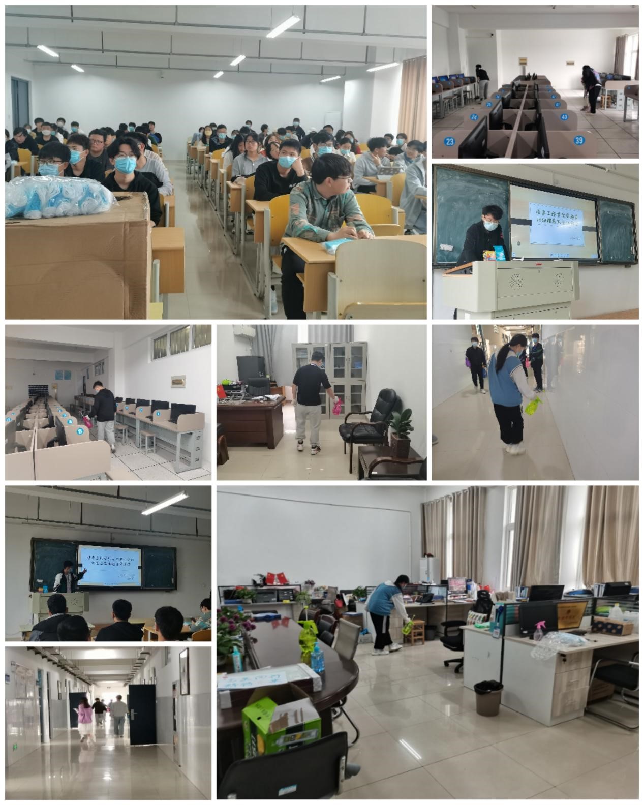 活动开始前,大家统一做好准备工作,戴好口罩,套好手套,分装酒精、消毒液,拿上扫帚簸箕活动便如火如荼的开始了。活动中,同学们对实验室、实训室、教师办公室、走廊等进行清理、消杀,开展活动的同时,深入普及健康卫生、疫情防控知识,从源头上清除病源滋生的环境,为打赢疫情防控阻击战发挥基础性作用,工科楼B楼所到之处皆留下同学们消杀的脚印。