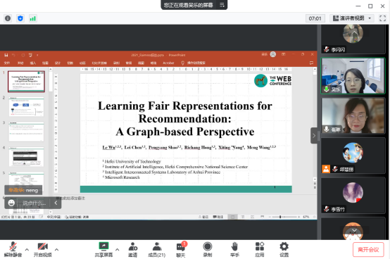 吴乐教授主要研究领域包括个性化推荐、可解释与公平性用户建模、数据挖掘及人工智能应用研究。近五年在知名国际期刊(如 IEEE/ACM Trans.)及国际会议(如SIGIR、WWW、KDD、AAAI、IJCAI、SDM、ICDM、CIKM)发表论文五十余篇。吴教授此次报告的主题是“个性化推荐中的公平性研究”。首先引出了人工智能与个性化推荐中公平性研究背景;其次,简要介绍了当前公平性研究的进展,包括公平性度量指标及实现公平性的模型;最后,详细介绍了在个性化推荐中,如何通过挖掘用户行为图结构性质实现公平性。