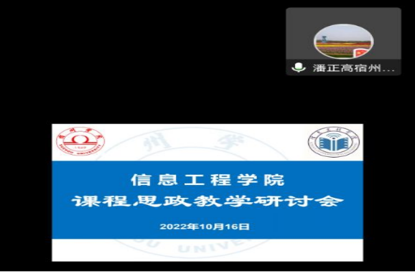 为落实立德树人根本任务,深化课程思政教学改革,引导广大教师潜心教书育人,提升教师课程思政教学能力。信息工程学院于2022年10月16日晚20:00-21:30通过腾讯会议线上召开课程思政教学大赛的培训会,参会的有教学副院长潘正高,科研副院长崔琳,教学秘书徐旭,教研室主任姜飞、张志伟,以及朱广良、陈黎黎等老师。会议由信息工程学院教学副院长潘正高主持。