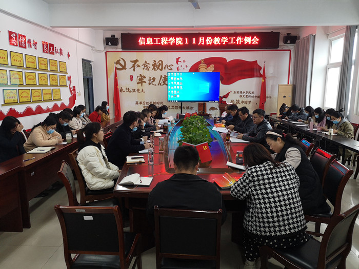 11月23日下午,信息工程学院在工B315会议室召开11月份教学工作例会,信息工程学院党委副书记余晓永(临时负责),党委副书记、院长许海峰,党委副书记、纪委书记吴孝银,科研副院长崔琳,教学副院长潘正高,组织员黄永刚及全体教职工参加会议。会议由许海峰主持。