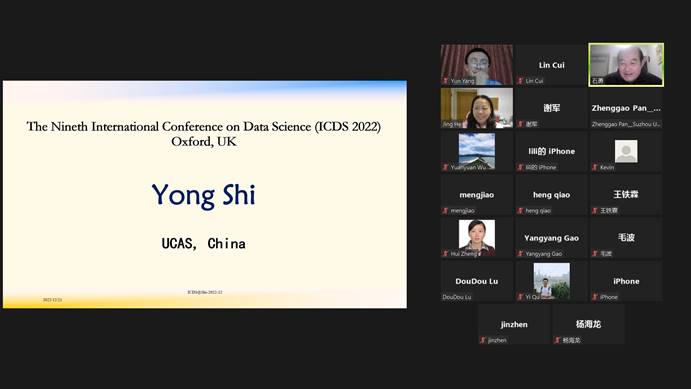 2022年12月21日,由牛津大学、中国科学院大数据挖掘与知识管理重点实验室、南京邮电大学、宿州学院、南京财经大学等联合举办的第九届数据科学国际会议(ICDS 2022)(The 9th International Conference on Data Science, ICDS 2022)以线上和线下相结合的方式成功召开。国务院参事、中国科学院大数据挖掘与知识管理重点实验室主任石勇教授担任此次大会的总主席。