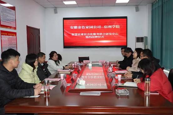 2月2日,安徽金色家园农业社会化服务有限公司与宿州学院共建智慧农业社会化服务研发中心揭牌仪式在安徽金色家园农业社会化服务有限公司会议室举行。宿州市妇女联合会党组成员、副主席陈芳芳、宿州学院信息工程学院党委书记余晓永、院长许海峰、安徽金色家园农业社会化服务有限公司董事长戚仁杰共同为智慧农业社会化服务研发中心揭牌。宿州市妇女联合会发展部部长岳永、宿州学院信息工程学院科研副院长崔琳、科研秘书邱慧丽、学生事务科科长吴雨桐、安徽金色家园农业社会化服务有限公司总经理孙韩、运营总监张遵贤等共同出席了揭牌仪式。