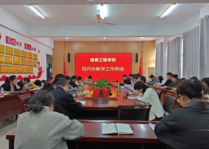 4月12日下午,信息工程学院在工B315会议室召开四月教学工作例会,信息工程学院党委书记余晓永,党委副书记、院长许海峰,组织员黄永刚,党委副书记、纪委书记吴孝银,科研副院长崔琳,教学副院长潘正高及全体教职工参加会议。会议由许海峰主持。
