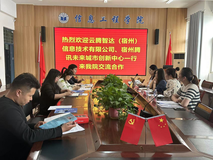 2023年5月15日中午,云腾智达(宿州)信息技术有限公司总经理梁媛媛和人事经理李言言、宿州腾讯未来城市创新中心总经理于蕾和市场主管杨子超一行来我院交流合作。信息工程学院科研副院长崔琳、科研秘书邱慧丽和部分教师参加了此次活动。