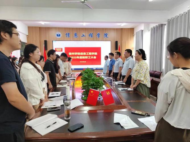 会议在庄严是国歌声中拉开序幕。首先,许海峰汇报信息工程学院2022年度工作总结报告。一是学习习近平新时代中国特色社会主义思想,建立常态化学习机制,加强人才培养,落实立德树人根本任务;二是加强对人才队伍的建设,一方面积极引进优秀人才,另一方面做好对青年教师的培育;三是推进本科教学的改革与发展,2022年学院在学生竞赛、论文、专利等方面均有所突破;四是加强与地方企业的合作,服务地方成效显著;五是团学工作成果丰富。
