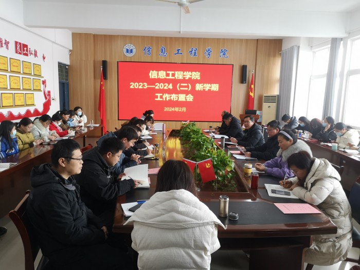 2月26日上午,信息工程学院在工B315会议室召开新学期工作布置会,信息工程学院党委书记余晓永,党委副书记、院长许海峰,组织员黄永刚,党委副书记、纪委书记吴孝银,科研副院长崔琳,教学副院长潘正高及全体教职工参加会议。会议由许海峰主持。