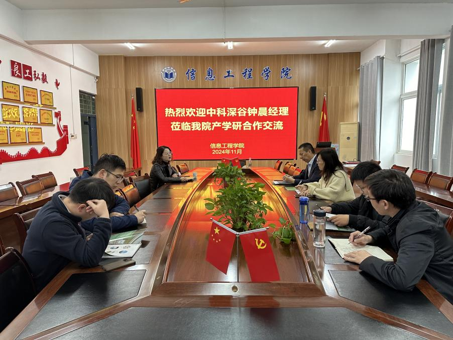 2024年11月18日,信息工程学院与合肥中科深谷科技发展有限公司在工科楼B楼315会议室举行了产学研合作研讨会,信息工程学院党委副书记、院长崔琳、副院长张万礼、科研秘书邱慧丽、实习实训中心主任田文泉、教研室主任张志伟、姜飞、秦闻博、教师李松州,合肥中科深谷科技发展有限公司钟晨经理参加会议。会议由崔琳主持。