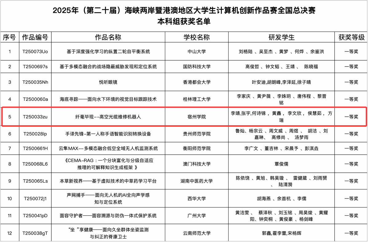 7月14日至7月15日,2025年(第二十届)海峡两岸暨港澳地区大学生计算机创新作品赛总决赛在四川省乐山举行。来自全国27个省市及港澳台地区的500余所高校、共计2000余支队伍积极参赛。经过初赛的严格筛选,最终有195项优秀作品脱颖而出,成功晋级总决赛(其中本科组118项、高职组77项)。我院的“纤毫毕现——高空光缆维修机器人”团队在比赛中脱颖而出,在演讲和答辩环节赢得了现场十余位评委专家的一致好评,最终荣获全国一等奖和本科组实用价值奖的优异成绩。