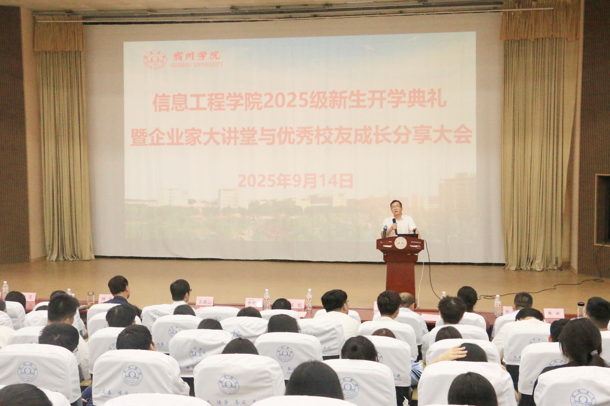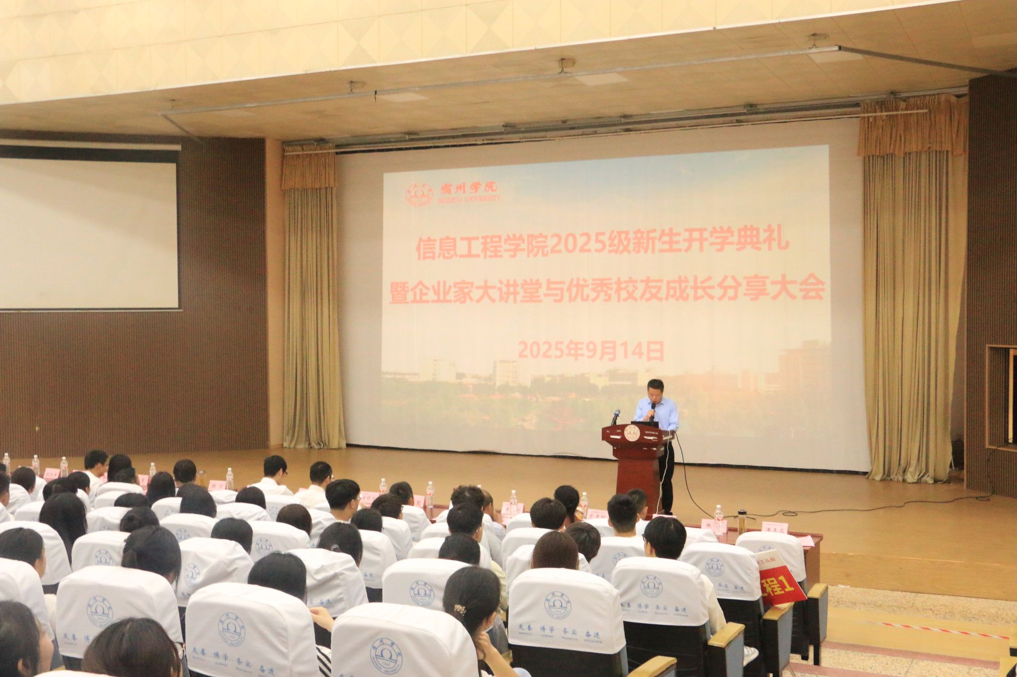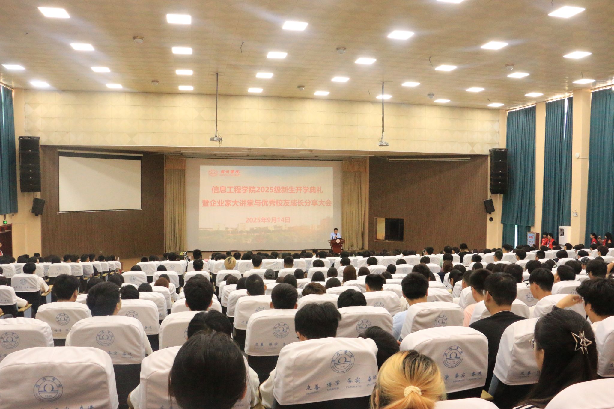 信息工程学院于9月14日上午,在大学生活动中心举办2025级新生开学典礼暨企业家大讲堂与优秀校友成长分享报告会。信息工程学院党委书记余晓永,党委副书记、院长崔琳,组织员(正处级)黄永刚,党委副书记、纪委书记吴孝银,副院长潘正高、张万礼,教师代表及特邀嘉宾、25 级辅导员和25 级全体新生参会,潘正高主持活动。