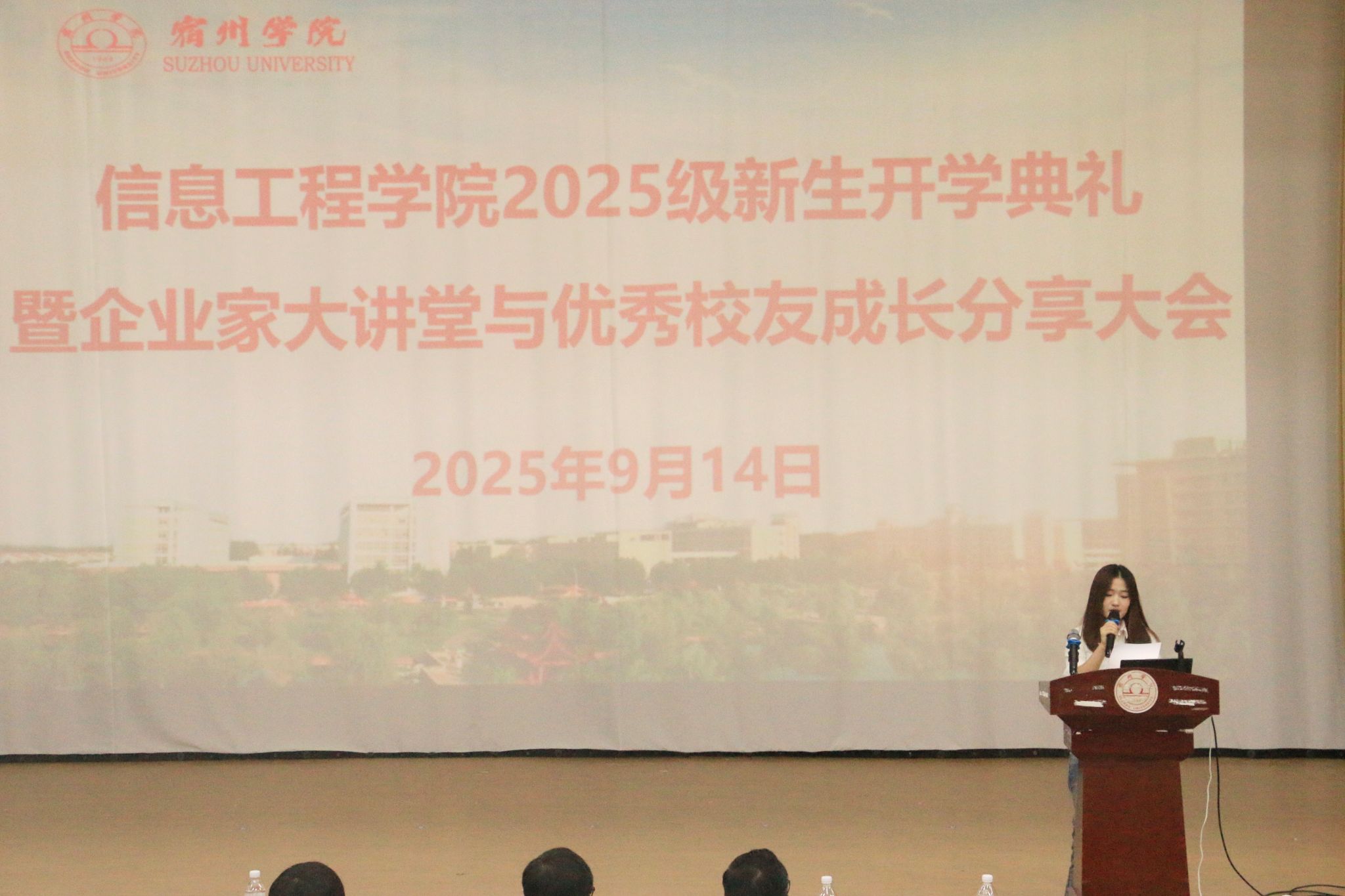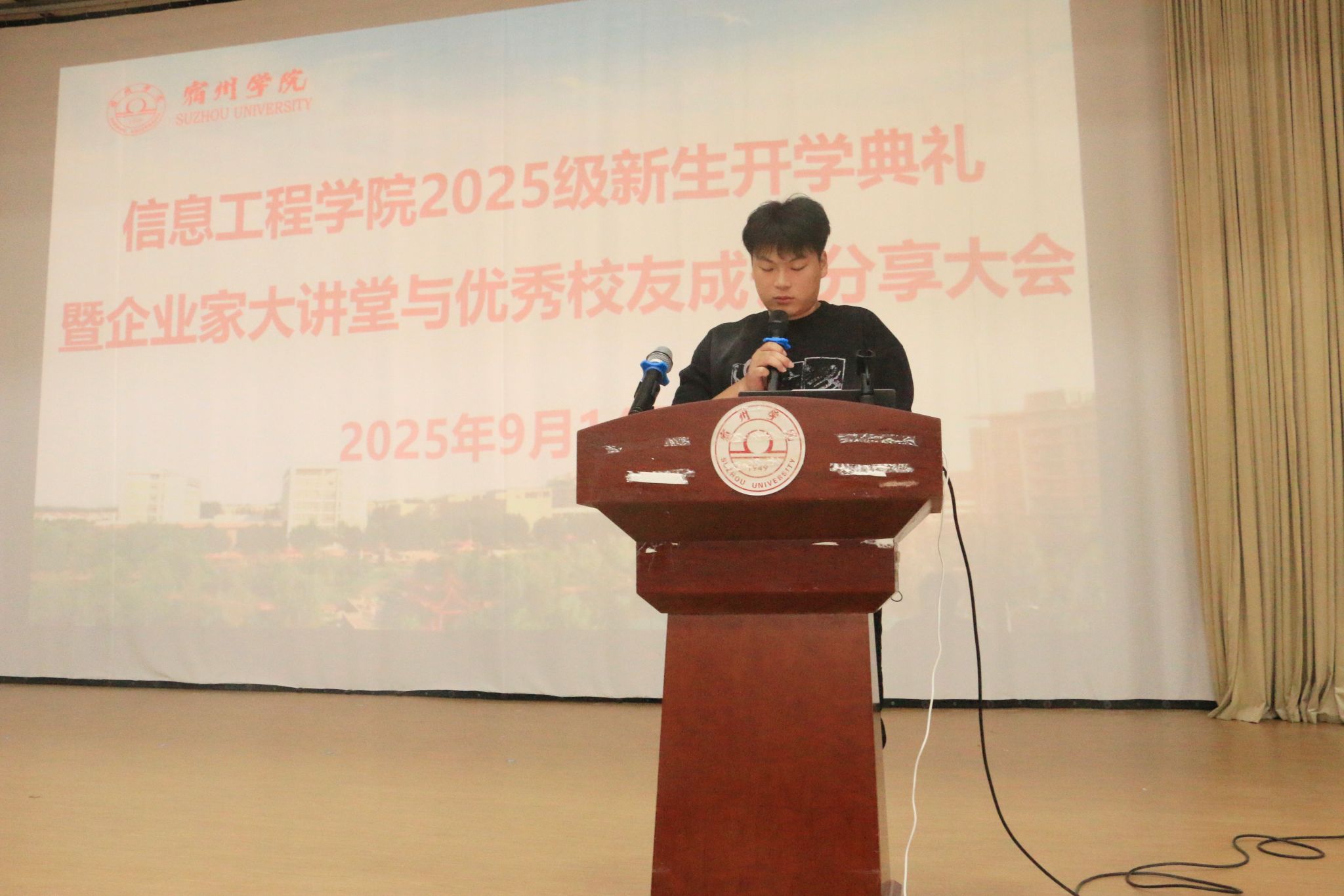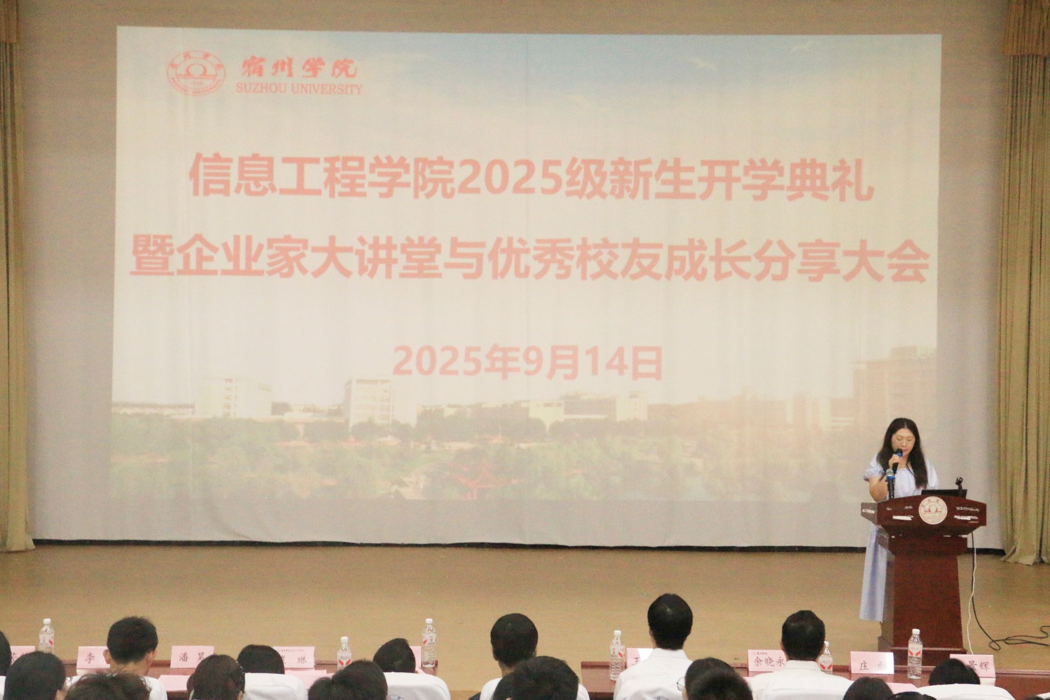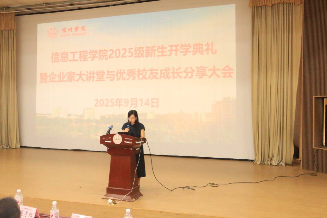 信息工程学院于9月14日上午,在大学生活动中心举办2025级新生开学典礼暨企业家大讲堂与优秀校友成长分享报告会。信息工程学院党委书记余晓永,党委副书记、院长崔琳,组织员(正处级)黄永刚,党委副书记、纪委书记吴孝银,副院长潘正高、张万礼,教师代表及特邀嘉宾、25 级辅导员和25 级全体新生参会,潘正高主持活动。