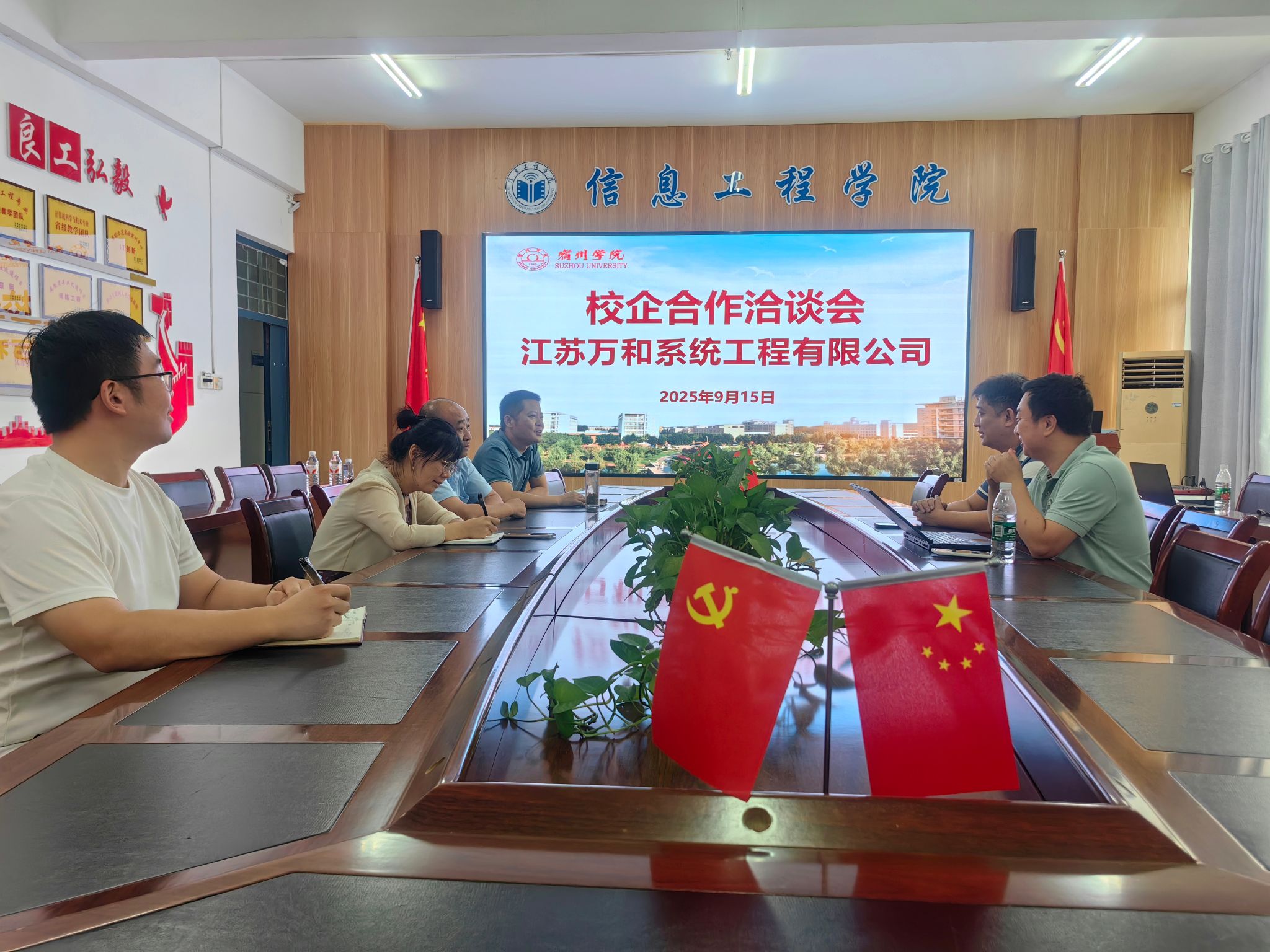 2025年9月15日上午,信息工程学院与江苏万和系统工程有限公司召开校企合作洽谈会,信息工程学院党委副书记、院长崔琳,组织员(正处级)黄永刚,副院长潘正高、实习实训中心主任田文泉,江苏万和系统工程有限公司苏正坤、朱庆参加会议。会议由崔琳主持。