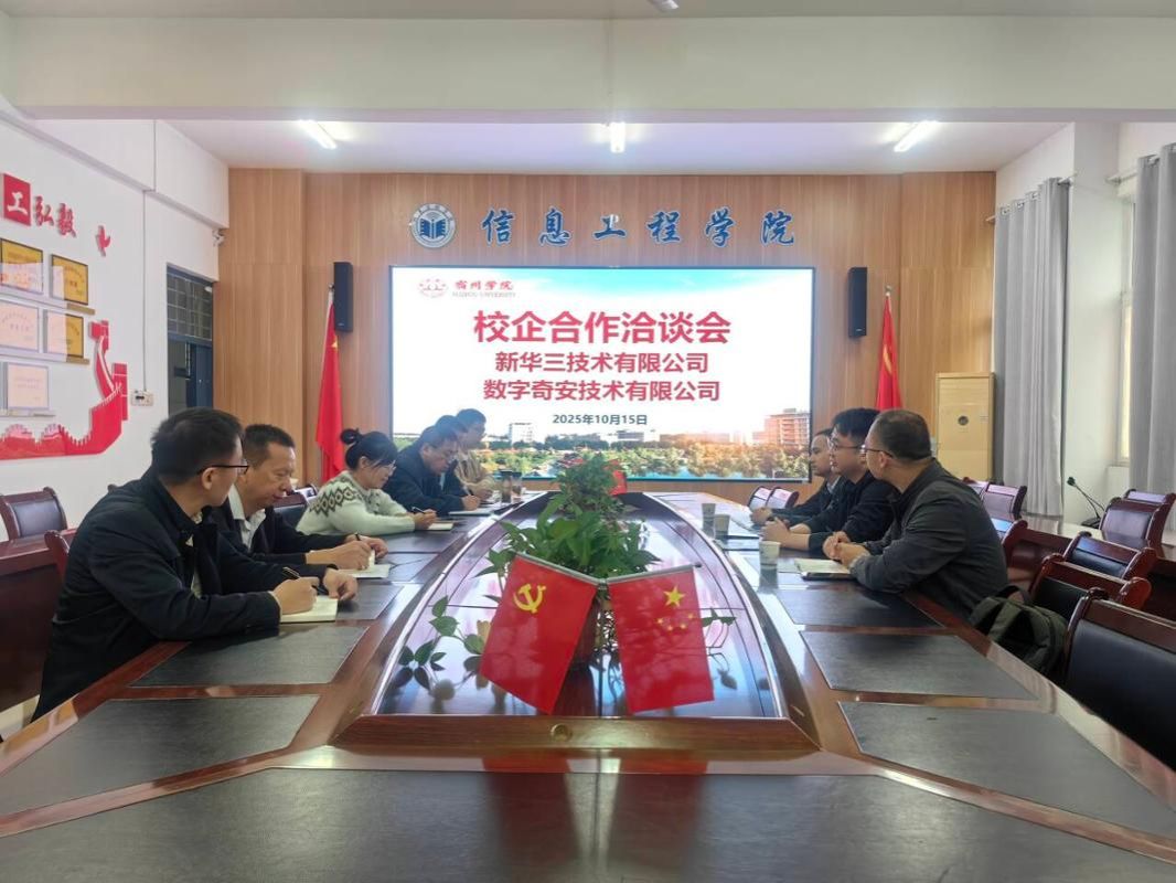 2025 年 10 月 15 日,信息工程学院与新华三技术有限公司、数字奇安技术有限公司联合召开校企合作洽谈会,旨在进一步深化产教融合,明确后续合作方向,为高素质技术人才培养搭建更优质平台。信息工程学院党委副书记、院长崔琳,副院长潘正高、张万礼,实习实训中心主任田文泉,专业教师代表朱广良、姜飞出席会议;新华三技术有限公司代表石磊、王义军,数字奇安技术有限公司代表李南飞受邀参会。会议由崔琳主持。