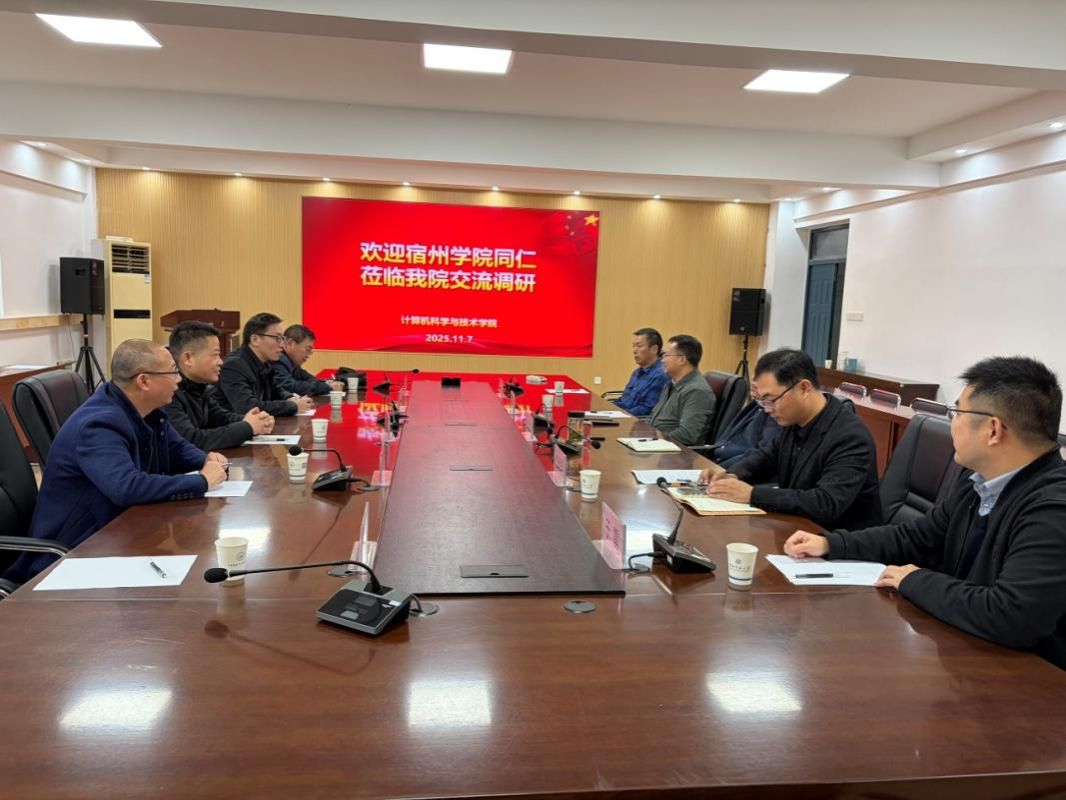2025年11月7日,为进一步提升学科建设质量,优化专业发展布局,推进工程教育认证工作,校办公室副主任董全德、信息工程学院教学副院长潘正高带领相关专业负责人及骨干教师,赴淮北师范大学计算机科学与技术学院开展交流调研活动。淮北师范大学计算机科学与技术学院党委书记张启航、院长余磊、副院长江明明及相关系部负责人热情接待了调研组一行,双方围绕多方面核心议题展开深入研讨,并共同参观了实验室。