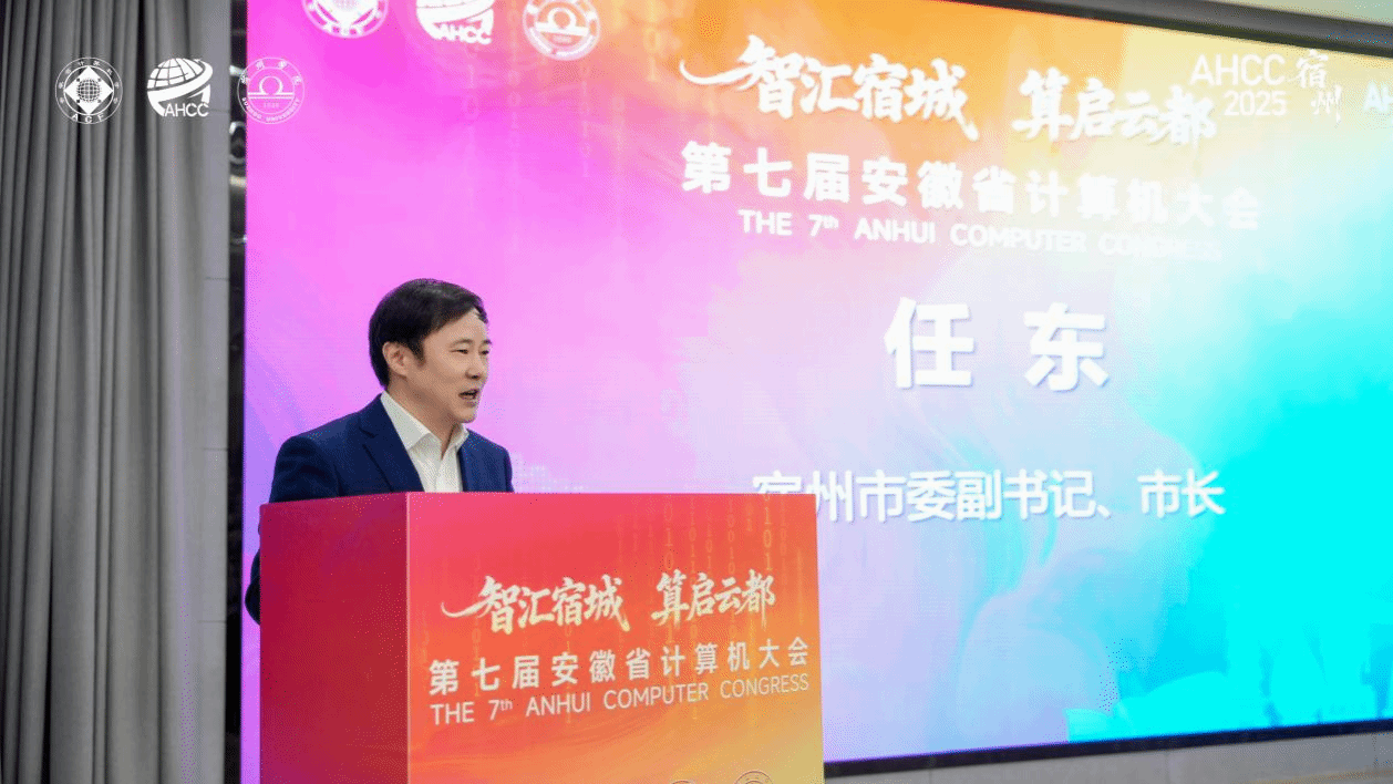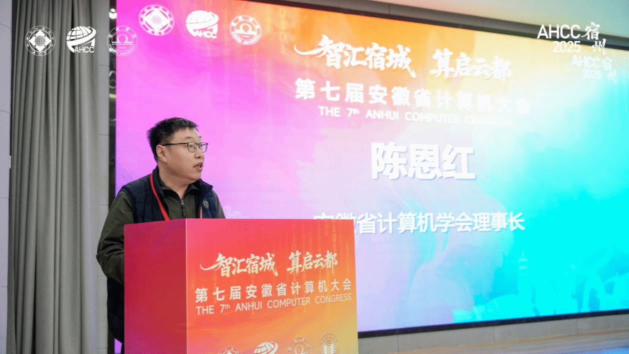 陈恩红致欢迎辞。他代表大会主办单位感谢省科协、宿州市委市政府、宿州学院等各方支持,向参会的嘉宾和专家学者表示热烈欢迎。他表示,计算机大会既是深化合作的重要契机,更是思想碰撞的交流平台,本次大会必将为安徽打造科技创新资源地、宿州建设智慧云城注入更强动力,携手开启区域数字产业发展新篇章。