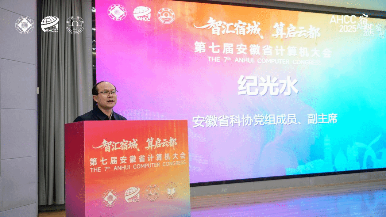 纪光水代表省科协向大会顺利召开表示祝贺。他指出,算力已成为驱动经济社会发展的核心要素。党的二十届四中全会提出深入推进数字中国建设,强化算力与算法支撑,全力实施“人工智能+”行动。本次大会聚焦人工智能创新应用,积极展示科技成果,凝聚各方合力推动科技创新与产业发展,为数字安徽建设提供智力和科技支撑。