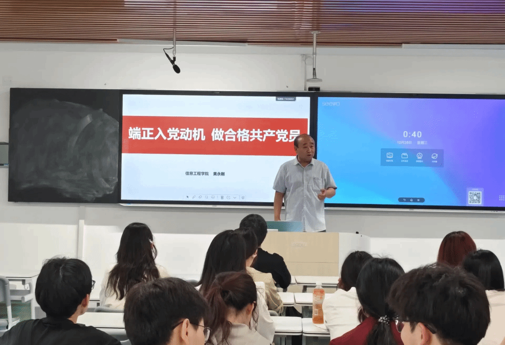为了进一步提高入党积极分子的思想政治素质和理论素养,引导青年学子坚定理想信念,2025年5月14日,信息工程学院正处级组织员黄永刚讲授主题为“端正入党动机,争做‘四讲四有’合格共产党员”专题党课,信息工程学院46期入党积极分子参加。