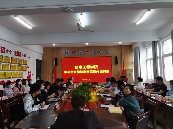 按照学校“关于开展向全省纪检监察系统先进典型学习活动的通知”要求,信息工程学院于2023年5月24日下午在工B315开展了向全省纪检监察系统先进典型学习活动,本次活动由信息工程学院党委副书记、纪检书记吴孝银主持,全体党员教师参加。