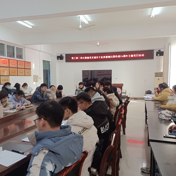 今年是中国人民志愿军抗美援朝出国作战70周年。70年前的这场战争被称为“新中国的立国之战”,它维护了亚洲和世界和平,巩固了新生的人民政权,使中国的国际威望空前提高,极大地增强了民族自信心和自豪感。为此,软工第二和大数据应用专业学生党支部于2020年12月17日下午3:00在工B315举办学习抗美援朝作战70周年主题党日活动。