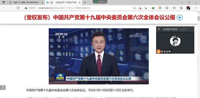 为深入贯彻落实党的十九届六中全会精神,进一步深刻理解和把握新发展格局对教育教学的新要求,12月19日下午,信息工程学院软件工程教研室教师党支部召开12月份政治理论学习会暨开展《中国共产党第十九届中央委员会第六次全体会议公报》学习活动。结合当前疫情防控要求,本次活动在线上腾讯会议平台开展,软件工程教研室教师党支部书记张志伟主持,支部全体教师党员参加。