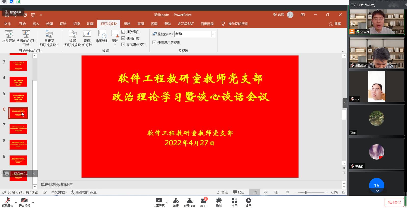 2022年4月27日,软件工程教研室教师党支部召开4月份政治理论学习暨党员谈心谈话会议,在坚持疫情防控的前提下,本次会议以线上腾讯会议的方式召开,会议由党支部书记张志伟主持,支部全体党员参加。