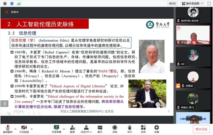 为加强软件工程教研室思想政治工作,促进教学活动发挥出立德树人的功能,软件工程教研室及党支部在学院的统一部署下,2022年10月6日20:00—21:00,组织教师参加计算机课程思政虚拟教研室(带头人:桂林电子科技大学计算机与信息安全学院董荣胜教授)在腾讯会议举行的学术研讨会。会议邀请合肥工业大学李廉教授,暨南大学古天龙教授,分享他们关于教研室聚焦的科学思维和科技伦理的研究报告,会议由高等教育出版社计算机分社韩飞社长主持。
