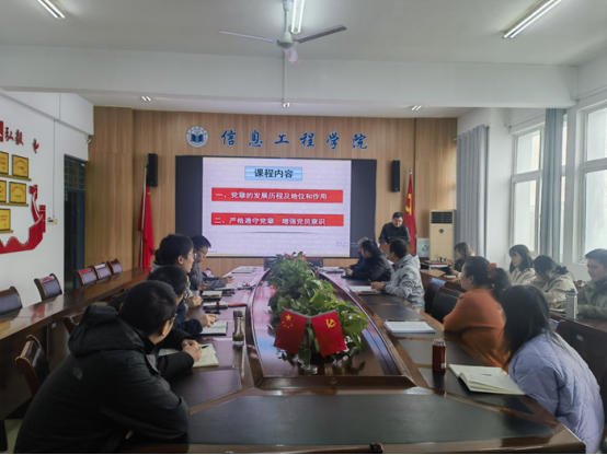 为进一步深入开展学习贯彻习近平新时代中国特色社会主义思想主题教育,全面学习、全面落实党的二十大精神,深入学习党章,11月13日上午,信息工程学院党委副书记、院长许海峰讲授“学习遵守党章 增强党员意识”主题教育专题党课。科级以上干部、党支部书记、辅导员和教研室主任参加学习。