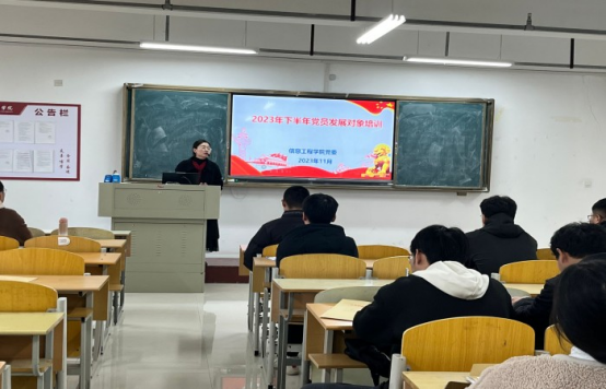 为深入学习贯彻习近平新时代中国特色社会主义思想和党的二十大精神,进一步加强党员发展对象培养教育,11月14日,信息工程学院在实训楼A113举办2023年下半年党员发展对象线下培训。
